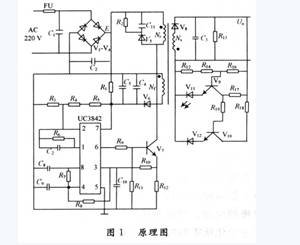 原理图如图1所示,它由如下元件构成:C1,V1~V4,C2组成滤波整流电路,变压器T为高频变压器,V5,R2,C11组成功率开关管V7的保护电路,NF为供给IC电源的绕组。单端输出IC为UC3842,其8脚输出5 V基准电压,2脚为反相输入,1脚为放大器输出,4脚为振荡电容C9,电阻R7输入端,5脚为接地端,3脚为过流保护端,6脚为调宽单脉冲输出端,7脚为电源输入端。R6、C7组成负反馈,IC启动瞬间由R1供给启动电压,电路启动后由NF产生电势经V6,C4,C5整流滤波后供给IC工作电压。R12为过流保护取样电阻,V8,C3组成反激整流滤波输出电路。R13为内负载,V9~V12及R14~R19组成发光管显示电路。V5,V6选用FR107,V8选用FR154,V7选用K792,当V7导通时,整流电压加在变压器T初级绕组Np上的电能变成磁能储存在变压器中,在V7导通结束时,Np绕组中电流达到最大值:Ipmax:Ipmax=(E/Lp)ton式中:E为整流电压;Lp为变压器初级绕组电感;ton为V7导通时间。在V7关闭瞬间,变压器次级绕组放电电流为最大值Ismax,若忽略各种损耗应为:Ismax=nIpmax=n(E/Lp)ton。式中:n为变压器变比,n=Np/Ns,Np,Ns为变压器初、次级绕组匝数。高频变压器在V7导通期间初级绕组储存能量与V7关闭期间次级绕组释放能量应相等:n(E/Lp)ton=(Uo/Ls)toff,式中:Ls为变压器次级绕组电感;Uo为输出电压;toff为V7关闭时间。
