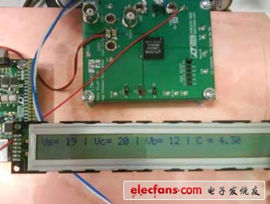 图 6:LCD 读数:Vs (太阳能电池板电压);Vc (充电电路电压);Vb (电池电压);C = 充电电流 (4.3A),用DC590B PIC 微控制器控制;用 LTC2418 演示板 DC571 ADC 读取电压,该演示板由 LTM4601演示板 DC1041A 微型模块降压型稳压器供电。