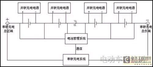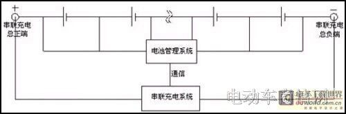 由于上述三种充电方法都存在一定的问题,本人发展出一种最适合高电压电池组,特别是电动汽车电池组的充电方法,即采用电池管理系统和充电机协调配合串联大电流充电加恒压限流的并联小电流充电的模式,原理图见下。