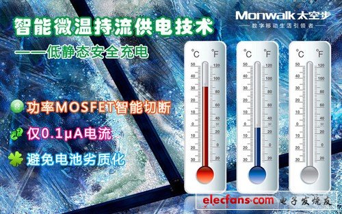 移动电源给不同数码产品进行充电时,过度放电会引起移动电源寿命,甚至会烧坏手机等数码产品。太空步智能微温持流供电技术,内部通过电压智能检测系统,当锂电池电压低于其过度放电电压检测点时将激活过度放电保护,使功率MOSFET由开转变为切断而截止放电,以避免移动电源过度放电现象产生,并将电池保持在低静态电流的待机模式,电流仅维持在0.1μA,从而防止移动电源过度放电,导致电解液因分解而导致电池特性劣化,并造成充电次数的降低,延长移动电源的使用寿命。
