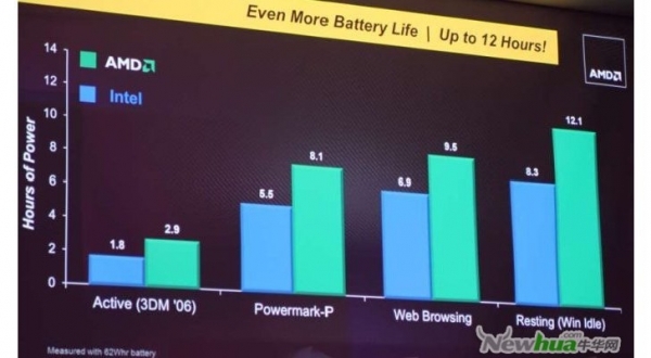 AMD让英特尔经历了首日令人印象深刻的发布会,但展会最后一天,AMD让英特尔形象受挫,AMD的APU(加速处理器)在3D应用程序中节省约61%的电池寿命。选择测试的应用程序是Futuremark的3D Mark 2006,测试用的处理器的AMD的E系列和一款不知名的英特尔处理器。