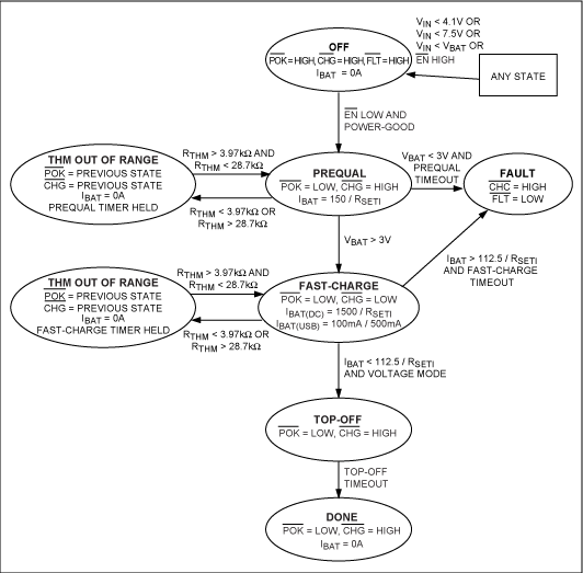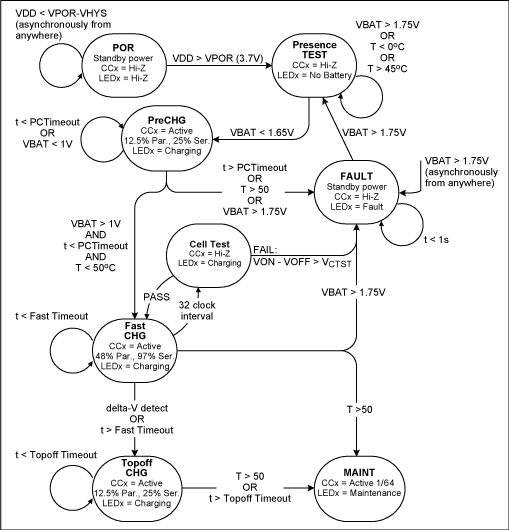快速充电模式下,如果超过最大充电时间,充电器会从快速充电模式切换到浮充模式,同时复位计时器。计时器开始为浮充过程计时,如果达到预定的浮充时间,充电器将从浮充模式切换到涓流模式(图3)。