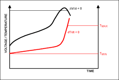 图2.这些曲线显示了NiMH充电电池充电过程中典型的电压(顶部)和温度(底部)随时间的变化