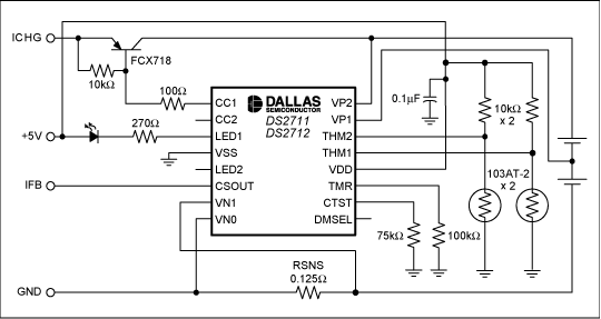图3.该典型应用电中,DS2711电池充电器为2个的镍氢充电电池充电
