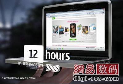 从参数来看,诺基亚Booklet 3G的机身厚度约为20mm,那么基本可以判定其使用的是锂聚合电池,按照机身尺寸和机身重量(机身重量 1.25 kg)来看,电池预计容量在2600mAh~4200mAh之间。对于一般的上网本,4200mAh的电池容量正常上网使用,最多也就5个小时的续航时间。而从目前的消息来看,诺基亚Booklet 3G也只是一般的上网本,采用Atom平台,Windows操作系统。虽然上网本的性能不足以我们玩大型游戏,但是正常使用时,一般会使用无线网络,打开多个网页页面,有时甚至会播放一些音乐,这些都是相对耗电的操作,因此要想达到12小时的实际使用时间是不太可能的。
