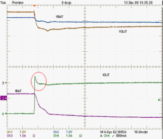 但DPPM机制有一些限制。第一种情况是,当系统电流发生快速瞬变时,电压会下降。这种情况如果发生在电池充电期间,如果系统电流处在突发方式下,输出端的负载电流会周期性地迅速从接近零升高到2A以上。由于这个电流超过了输入电源的最大容量,充电FET不得不将电流反向,提供一部分的突发电流。由于电流反向需要一定的时间,在这段时间内,输出电压会降低,导致电流产生畸变,如图2所示。第二各限制条件是IC设计的成本和复杂度,因为由两个通路元件需要调节。一个元件调节到系统的输出电压,另一个调节对电池充电的电压或电流。