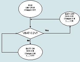 如果电池电压低于VPPM的阈值,SW1就开启,VOUT将变成4.2V的恒压源,向系统供电。与此同时,50mA的恒流源ITRKL被激活,在涓流模式下对电池充电,直到电压达到VPPM阈值(有一定滞后),然后SW1会关闭,电池就连到系统上。这样就解决了没电电池的启动问题。