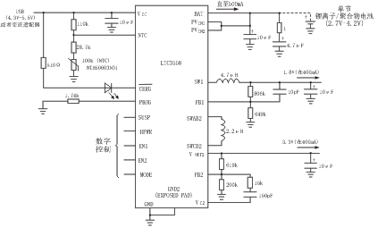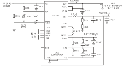 其充电器的充电电流可达950mA,降压开关稳压器的输出为1.2V(@400mA),降压-升压开关稳压器的输出为3.3V(@400mA)。充电器通过NTC热敏电阻将电池温度解扣点设置在0℃和40℃,LED用作充电状态指示。