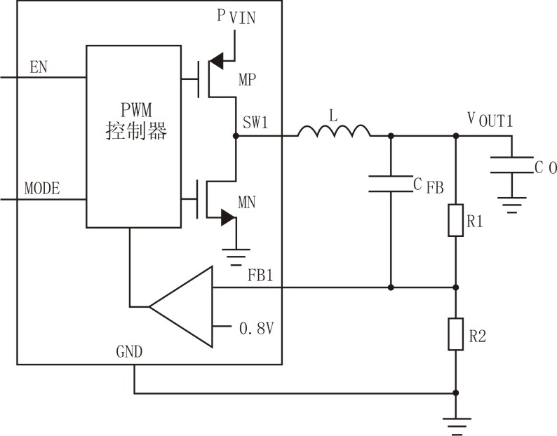 将IC引脚MODE拉至高电平,降压变换器将在突发模式操作,自动在固定频率PWM操作与滞后控制之间转换。当输出电容的充电电压稍高于调节点时,降压变换器则自动进入睡眠模式。在睡眠模式,开关稳压器的大多数电路将切断电源,因此在轻载时有着比脉冲跳跃模式更高的效率。