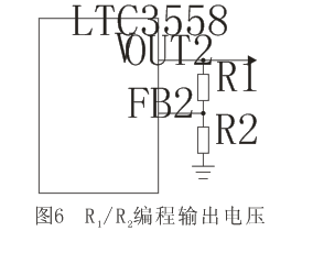 LTC3558的降压-升压开关稳压器在电压模式和2.25MHz的固定频率上操作,能提供直到400mA的输出负载电流,输出电压可在2.75V与5.45V之间来编程,其值为VOUT2=0.8V(1+R1+R2)。R1与R2为IC引脚FB2上的分压器电阻,如图6所示。