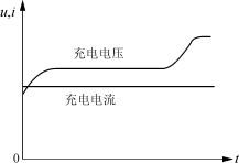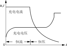 恒流充电法是用调整充电装置输出电压或改变与蓄电池串联电阻的方法,保持充电电流强度不变的充电方法,如图2所示。控制方法简单,但由于电池的可接受电流能力是随着充电过程的进行而逐渐下降的,到充电后期,充电电流多用于电解水,产生气体,使出气过甚,因此,常选用阶段充电法。