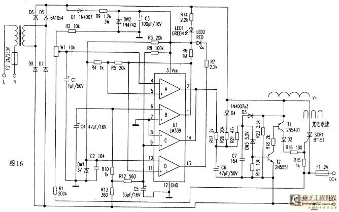 电路原理图见图16。工频变压器T1是降压变压器,D5~D8组成桥式整流,输出的脉动直流不经滤波供电瓶充电。