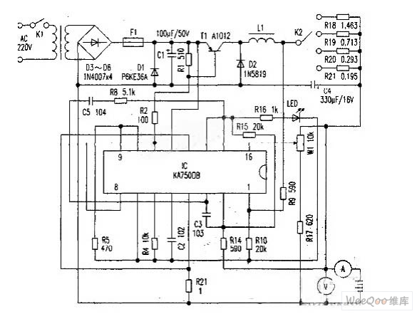 输出电流由K2选择控制,如果要输出电流大于1.5A,需增加T1的散热片面积,并将L1的线径加粗。其改制的难点是制作电阻:R18、R19、R20、R21。笔者通过查询得知φ0.13mm漆包线的阻值是1322Ω/km;φ0.21mm的漆包线阻值是506Ω/km,再经计算得出以上电阻所需漆包线长度后,绕制在圆柱形绝缘体上,并在调试中根据输出电流大小修剪漆包线的长度。