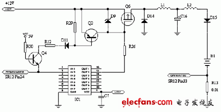 (3) 输出控制电路:单片机的输出控制信号通过电阻解码网络转化成模拟电压值,控制电压和电流比较器的基准值,实现对外围功率电路的控制。