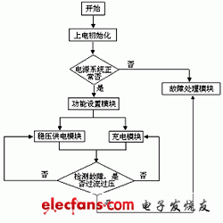 主程序流程图如图2所示。系统上电复位后,首先对单片机、外围芯片及控制状态进行初始化;然后设置输出控制口的电压阀值,通过读取输出电压的值来判断系统是否正常,若正常则进入功能设置模块,否则转故障处理;进入功能控制模块后,用户可以通过按键设置系统的工作状态,是供电模式还是充电模式。然后按下确定按钮,系统进入相应的工作模式。若是供电模式,单片机将实时监测各主要参量若发现故障或过流过压则转故障处理模块,没有的话继续监测。若是充电模式,插入电池后系统将监测是否反接,是则提出告警,否则将进入充电状态,在此过程中故障检测的过程和供电模式相同,但充电模块中有充电中止算法和定时算法,都是判断电池是否充满的算法。