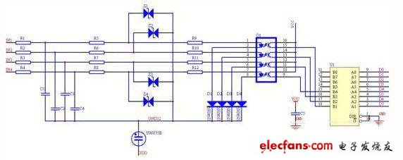 印制板设计时,要考虑到干扰对系统的影响,将电路的模拟部分和数字部分的电路严格分开,对核心电路重点防护,将系统地线环绕,并布线尽可能粗,电源增加滤波电路,采用DC-DC隔离,信号采用光电隔离,设计隔离电源,分析容易产生干扰的部分(如时钟电路、通讯电路等)和容易被干扰的部分(如模拟采样电路等),对这两种类型的电路分别采取措施。对于干扰元件采取抑制措施,对敏感元件采取隔离和保护措施,并且将它们在空间和电气上拉开距离。在板级设计时,还要注意元器件放置要远离印制板边沿,这对防护空气放电是有利的。样电路的原理图设计参见图1。