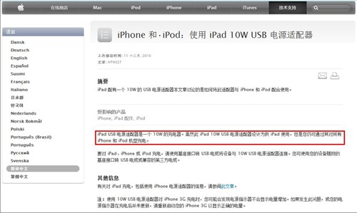 而这则消息是为属实呢?再没经过实际的测试之前,我们难下定论,不过笔者也在苹果官网找到了相关的说明,说明并没有证明iPad 10W充电器不能混用。