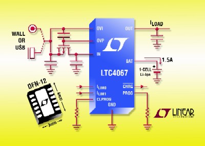 凌力尔特公司(LinearTechnologyCorporation)推出单片线性电源管理器、理想二极管控制器和独立电池充电器LTC4067,该器件适用于便携式产品和电池备份系统。LTC4067可以接受USB电源、交流适配器或电池电源。它具有PowerPath控制功能,可向外部设备供电,也可从USB总线或交流适配器电源给单节锂离子/聚合物电池充电。该器件有片上内部过压控制电路,与外部P沟道MOSFET配合使用时,对输入提供13V保护。系统负载电流增大时,LTC4067自动降低电池充电电流,从而确保输入电流不超过编程值。为了在总线连接时保持电池充分充电,该集成电路将电源直接导引到负载处,而不是从电池中抽取功率。一旦电源被去掉,电流就通过内部200mΩ低损耗理想二极管从电池流向负载,从而最大限度地降低了压降和功耗。