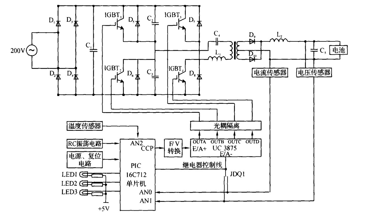 由图1和图2可以看出,蓄电池充电器主要由开关电源单元(电源变压器、整流电路及滤波电路)和监测与控制单元(传感器、电源专用集成芯片UC3875及微控制器P IC16C712)两部分组成。