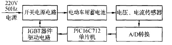 目前,电动车电池作为一种储能装置,主要以铅酸蓄电池为主,充电器是专门针对铅酸蓄电池所设计的。传统的蓄电池充电器采用电流/电压负反馈的方法来达到恒流/恒压充电的目的,为了实现充电过程各种工作参量的实时监测及智能多段式充电策略的精确控制,引入电流/电压反馈环,应用P IC16C712 单片机及相应的控制电路,其硬件结构框图如图1所示,电路图如图2所示。