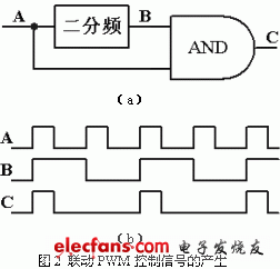 对于任一方波信号,要改变其占空比(对应于导通时间,即信号处于高电平状态的时间),一般有两种实现途径:一是改变其导通时间而频率保持不变,二是改变其频率而导通时间保持不变。本文采用后一种途径,即用PWM控制器输出的信号直接控制BUCK变换器,而在保持导通时间不变的情况下将其信号进行二分频,得到占空比减半的信号来控制单端反激变换器。具体实现电路如图2(a)所示,源信号经分频器二分频,得到频率减半的信号,再与源信号相与,即得到导通时间不变而频率减半的信号。电路中各点波形参见图2(b)。