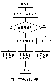 软件系统采用模块化设计方法,整个程序由主程序模块、各类电池充电子程序模块以及错误处理模块组成,各模块相对独立,以便于算法改进及功能扩充,其中主程序模块构架了软件系统的骨架,通过其对其他模块的调用来实现完整的充电过程控制,其流程图见图4。