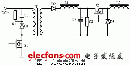 由于要求充电电源的输出变化范围为1.2V(0.3A)~60V(1.6A),采用单级变换器很难实现这 么大的变化范围,故采用了两级结构,电源主电路如图1所示,交流输入经整流滤波得到稳定的直流电压DCin,首先经单端反激变换器预稳压,并实现输入级与输出级的隔离,然后再经BUCK变换器进一步降压,得到所需输出电压。为了保证单端反激变换器能稳定工作,加入了假负载R2。由于电池等效于一个大电容,故输出端可不加滤波电容。