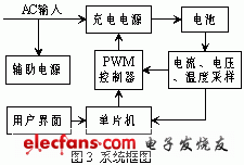 由于充电方法相对较复杂,且需要对多种类型和规格的电池进行充电,故需要采用可编程器件进行控制,而单片机以其相对强大的功能和低廉的价格成为首选。本文选用Motorola公司推出的 MC68HC908GP32作为主控元件,整个系统的组成框图如图3所示,反映电池充电状态的充电电流、电池电压和温度信号经采样电路送入单片机的A/D 转换口,单片机根据充电算法,通过D/A转换口输出信号控制充电电源的电压或电流给定,从而达到控制充电电源输出的目的。
