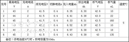 试验时间是在冬季,水温5℃。实验条件是统一用2A电流充电,最充电电压分别用43V、44V、45V轮循环依次进行,浮充转换电流一律400mA,记录下每次的充电时间,包括充电末期随时间电流下降各点数据、开始析气电压,按时间记录析气量。电池充完后,用万分之几精度的电量台记录放电容量。充入电量是在计算纸上读出时间电流曲线与坐标之间的面积(电容量就是充电电流对时间的定积分)。数据见下表: