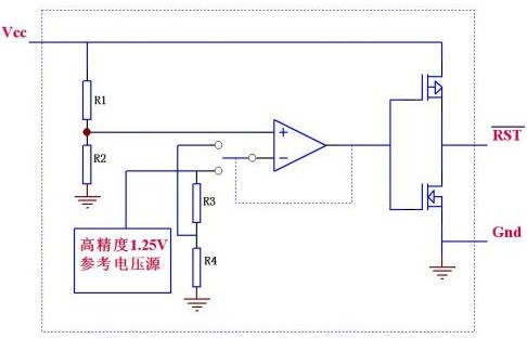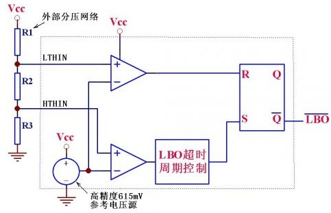 IC内含一个高精度的615mV基准电压源、两个比较器、一个RS触发器和其它一些逻辑电路,其大致功能是:VCC电压或其它待检测电压通过R1-R3组成的分压网络接在IC的LTHIN /HTHIN检测引脚,当待测电压下降导致LTHIN引脚低于615mV时,输出脚LBO输出低电平,而如果待测电压上升导致HTHIN引脚高于615 mV时,经过内部逻辑判断和简单延时后,输出脚LBO输出高电平。