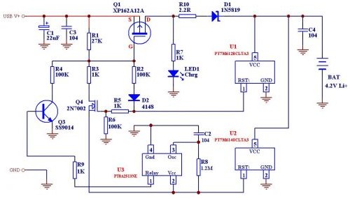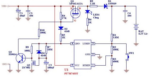 PT7M7433T是上海百利通公司最新设计的极高精度的一系列电压检测器的其中一款,其检测精度在0-Vcc (5.5V)范围内小于1mV,而且其批量IC的检测值偏差<±2.5%,这样完全保证了批量产品的性能一致性和极高的总体性能,我们利用其配合少量外部电路即可组成相当简单的锂电池充电线路。