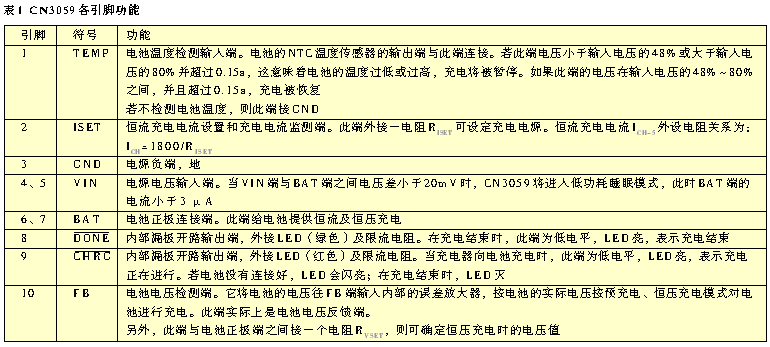 CN3059的电气参数:电源输入电压范围为4~6V;静态电流典型值为650μA;低压锁存电压为VIN≤3.61V;预存电阈值电压是电池电压小于2.05V;恒压充电电压3.6V;充电结束阈值电压(ISET端电压)为0.22V;睡眠模式阈值电压为VIN-VBAT≤20mV;睡眠模式解除阈值电压为VIN-VBAT≥50mV;TEMP端高温阈值电压为80%VIN,低温阈值电压为48% VIN。
