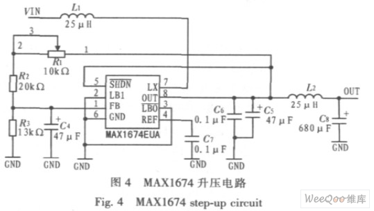 升压电路主要由升压式DC-DC 电源转换器MAX167 4组成,升压后输出4 V 直接对电池进行充电。MAX167 4升压电路如图4 所示。