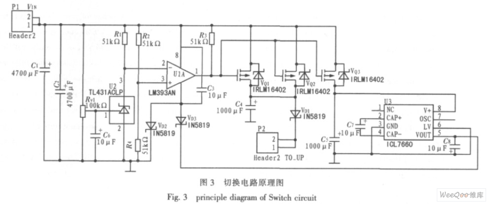 图3 中, 输入端VIN (P1) 接充电电源, 输出端P2 接MAX167 4升压电路的输入端,肖特基二极管VD1用于防止电流倒灌。稳压器TL431 为电压比较器LM393 的负输入端提供参考电压。输入端VIN(P1)通过滤波后接入电压比较器LM393 的正输入端。调节R_ad可调电阻,使输入小于3.6 V 时电压比较器LM393 输出负电压,P 沟道MOS 管IRLM16402VQ1、VQ2和VQ3导通,VQ1,VQ2的漏极连接升压电路, 使切换电路输入、输出端短接,使充电电压接至升压电路。当输入大于3.6 V 时,输出高电平,VQ1、VQ2和VQ3截止,此时MAX167 4升压电路无输入。VD2、VD3的作用是当电压大于3.6 V 时,LM393的负电源端接地; 当电压小于5.5 V 时,LM393 负电源通过VQ3接ICL7660 的负电压输出引脚。
