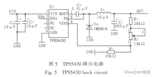 降压电路主要由降压DC-DC 转换器TPS5430 组成,降压后直接对电池进行充电。TPS5430 降压电路如图5 所示。