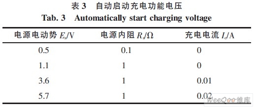 由表3 可见,当Es小于3.6 V 时,充电电流持续为0,一旦Es上升到3.6 V 后,充电电流由0 开始增加,即自动启动充电电压为3.6 V。