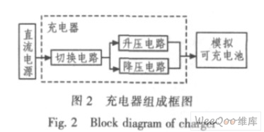 充电器硬件电路组成框图如图2 所示。充电器由切换电路自动判断直流电源输入电压, 选择升压或降压电路,实现在工作电压范围内自动切换, 模拟对充电电池的充电效果。