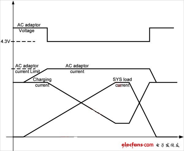 有些充电器(例如MPS公司的MP2607)可以根据不同电源要求,优化选择不同的动态电源路径管理方案。MP2607根据不同的适配器类型,在基于输入电压和基于输入电流的DPPM两种拓扑之间进行智能选择。若输入是交流适配器,MP2607采用基于输入电压的DPPM技术,控制适配器交流电压,使得交流适配器可以同时为系统供电和为电池充电,工作波形如图7所示。