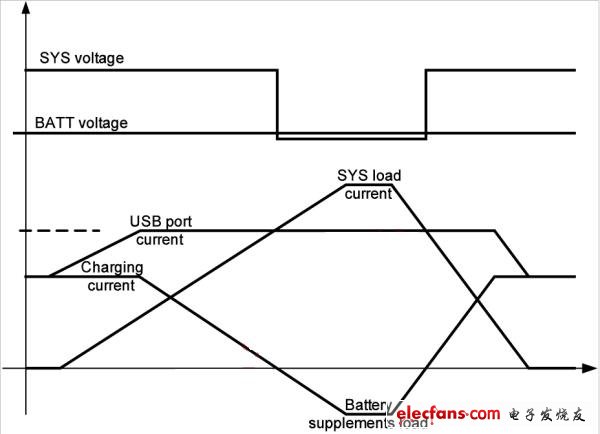 这种拓扑有三个主要特性:无论供电电压如何变化,系统电压始终等于电池电压,电源系统始终优先,以便IBATT £ ICHG,并且ICHG最终限制由输入电源提供给系统电源总线的最大功率。当系统与充电器断开时该拓扑还可以实现最小的耗散功率,设置ICHG从根本上限定了总输入电流,这样,随着系统电流(ISYS)的增加,充电电流(IBATT)将等额下降,工作波形如图2所示。