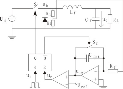 如图6所示为单周期控制Buck变换器控制框图,单周期控制技术实际上就是一种按扰动控制的开环控制系统。它将主功率电路的输入电压引入控制,随着输入电压的变化,得到不同的占空度,使得主功率电路的输出电压跟随给定量。理论上这种控制技术完全抵制了主功率电路的输出电压扰动,但是对负载的扰动却无能为力。