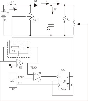 如图2所示为电压型控制Boost变换器控制框图,电压反馈控制技术是开关电源系统中经典的反馈控制方法。这是60年代后期开关稳压电源刚刚开始发展就采用的第一种控制方法,该方法与一些必要的过电流保护电路相结合,至今仍然被广泛的应用。