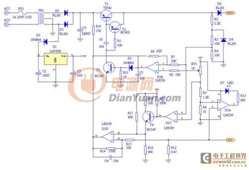 本电路设有反极性保护电路,由D4,U1C,U1D,T1及外围元件构成,当电池反接时,充电器限制输出电流不致发生事故(原理请读者自行分析,或Email给作者).充电指示由U1A,D7及外围元件构成,充电时,D7点亮,充电器进入浮充状态后,D7熄灭,表示充电结束.