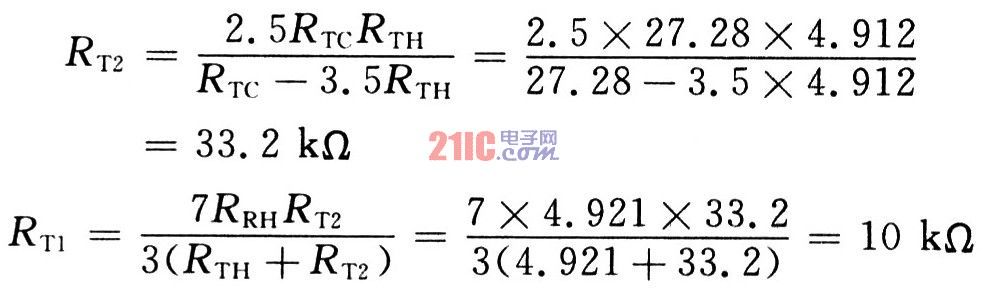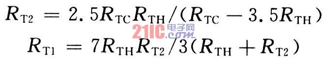 外部热敏电阻RT1和RT2可以用来设置选择温度控制充电窗口,如图6所示。假设RTH和RTC是热敏电阻的高低温极限值,RT1和RT2是负温度系数热敏电阻,则RT1和RT2可以用如下公式计算,先计算RT2,然后将RT2代入计算RT1: