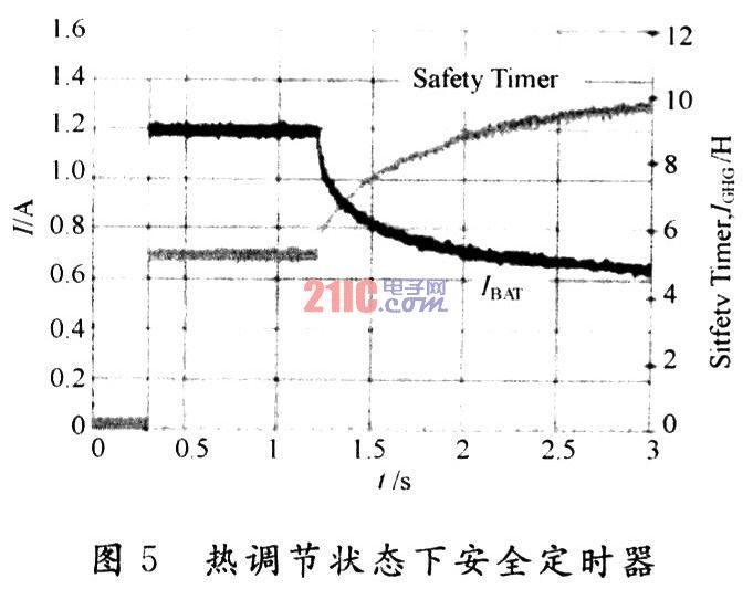 热调节通常在快充早期阶段进行,不过如果在CV模式下它仍然工作的话,充电电流就会过早达到充电终止阈值。为了避免错误充电终止,只要散热调节回路在工作,电池充电终止功能就会被禁用。此外,有效充电电流降低会延长电池充电时间。如果充电安全计时器有固定设置的话,就会过早终止充电。BQ24060采用动态安全计时器控制电路,能在热调节阶段有效延长安全时间,并尽可能降低安全计时器的故障几率。从图5中可以看出,热调节模式下的安全计时器的响应与有效充电电流成反比。