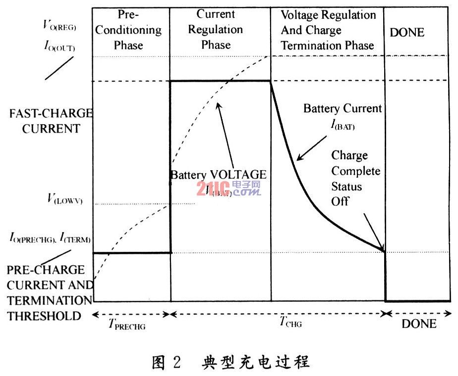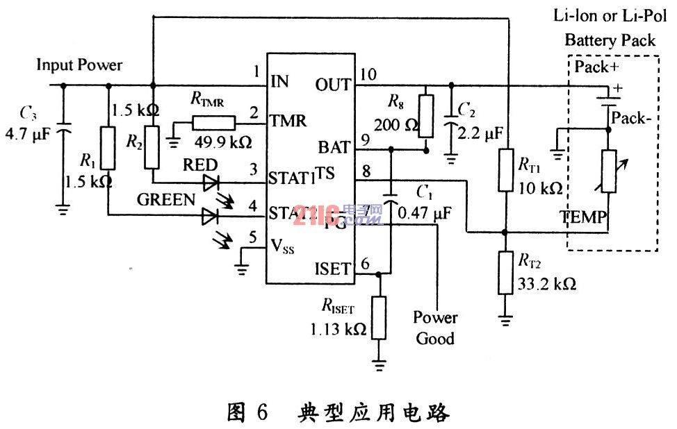 如果非理想的工作条件引起IC结温达到极限值Tj,充电循环激活内部控制回路系统将被调节,并控制其它充电控制回路,进而减小充电电流,直到IC结温小于Tj,使IC工作于安全温度下。