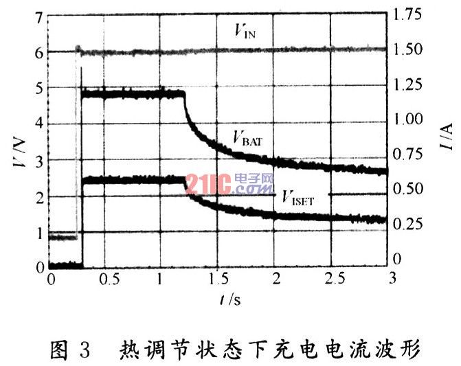 如何改进设计才能确保充电器在安全散热范围内正常工作,TI公司的锂离子电池充电专用芯片BQ24060,引入了热调节环路,可避免充电器过热,给工程师设计安全的充电器提供了方便。BQ24060内部芯片温度达到预定义的温度阈值后(如110℃),IC温度只要进一步提升就会让充电电流下降,这有助于限制功耗,并为充电器提供热保护。使结温升高到热调节的极大功耗取决于PCB板布局、散热通孔的数量以及环境温度。从图3中看出,1.2 s之后,热环路会在2 s以内将有效充电电流从1.2 A降到600 mA。
