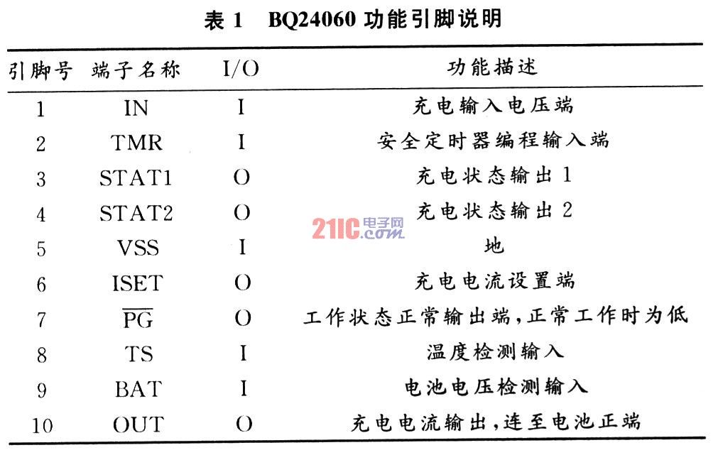 BQ24060是TI公司的一个高集成的锂离子电池充电管理IC,其功能引脚如图1所示,表1介绍了各引脚功能。BQ24060提供能在有限空间里完成多功能的、安全的满充电的锂离子电池充电器设计,其内部集成了1 A功率FET以及电流传感器,因而能够承受高达26 V的输入电压。该产品还提供具备独特安全与低压降特性的全面充电管理功能,以延长电池使用寿命。BQ24060可以使锂离子电池分三阶段进行充电:预充电方式、恒流热调节充电方式、精确恒压充电方式。充电终止是基于一个最小电流。内部可编程充电定时器为充电终止和在热调节状态动态调节提供安全保障。