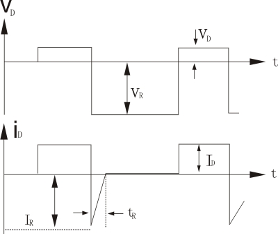 其中正向导通电流ID较大,但正向导通压降VD约为0.6~0.7V,tD为正向导通时间。